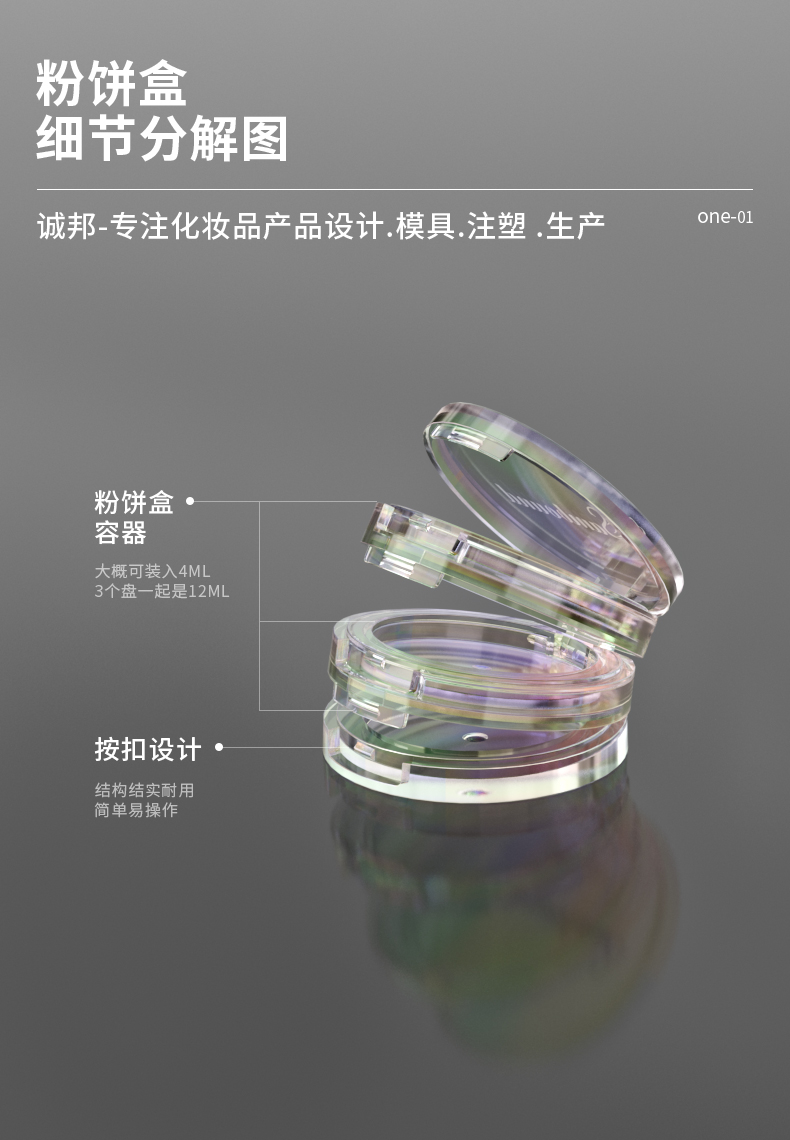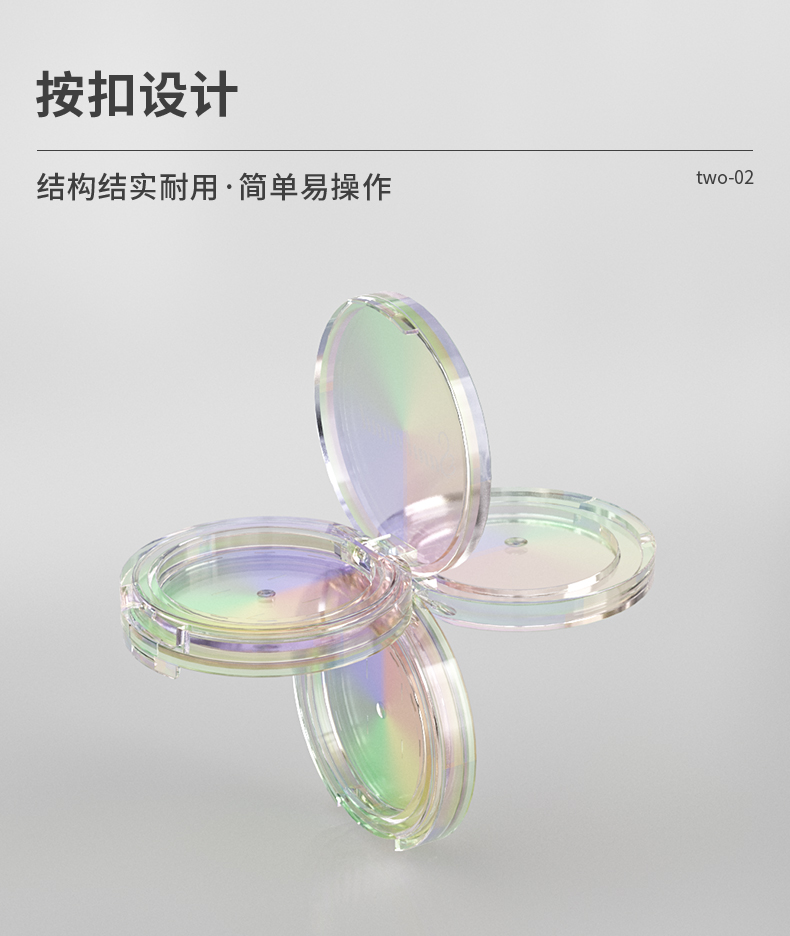 三層透明空粉餅盒化妝品包材廠家,該產(chǎn)品特點(diǎn):可以電鍍炫彩,也可以根據(jù)客戶需求定制透明或者其他顏色,產(chǎn)品的層數(shù)可以疊加。